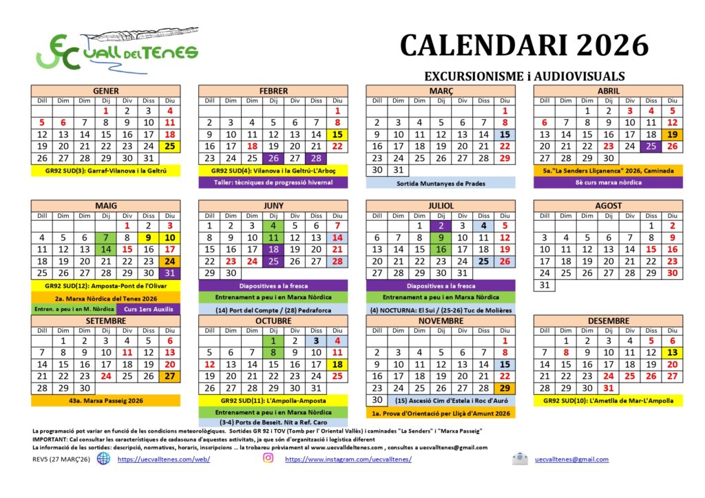 Aquest calendari és la proposta d’activitats excursionistes i d’audiovisuals pel 2026, que des de l’entitat hem posat dates i que esperem que siguin del vostre interès.