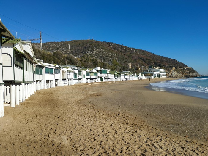 Fotografia: Platja de Garraf. Inici de l’etapa. Petita cala sorrenca enmig del massís. A la platja, les cases típiques de fusta d’estiueig que avui dia ens han arribat. La UEC hi té una caseta, de les 33, de 10 places, oberta només la temporada d’estiu.