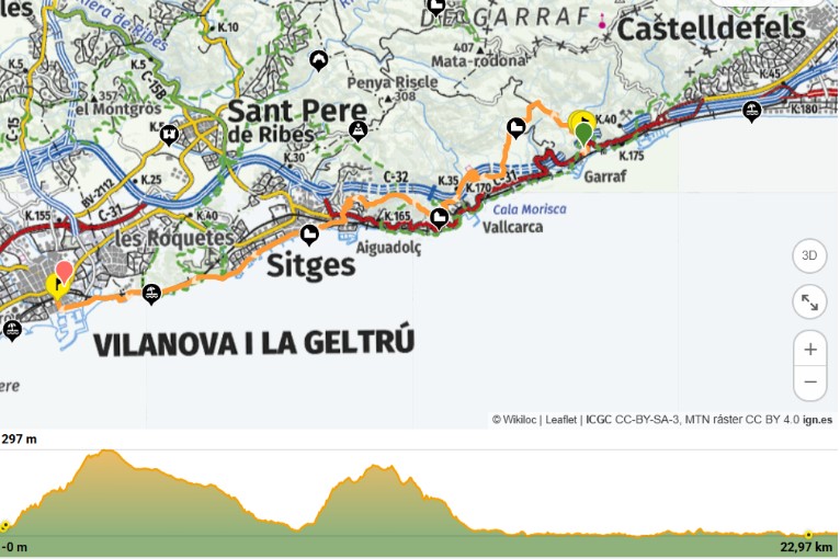 El track ens mostra el punt d’inici i final, que corresponen a les proximitats de les estacions de tren respectives, de Garraf i Vilanova i la Geltrú.